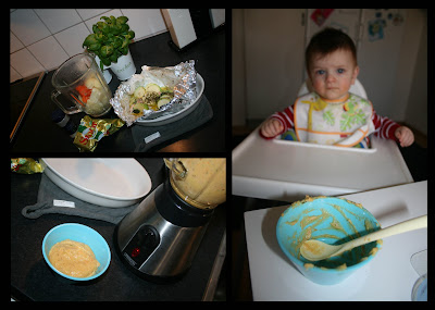 Oliver har ju som sagt varit sjuk och då har han ätit så dåligt. Igår, måndag, när vi var på babysången gav jag hon en burkmat jag hade med mig. Han åt iaf upp halva burken. Men sen ville han leka. Sen på eftermiddagen upptäckte jag en ny burkmat och även den provade vi och det gick bra. Alltså har han börjat äta fast föda igen. Så idag var det bara och kavla upp ärmarna och börja laga barnmat. Det blev lax och squash med smör, dill och lite lime i folie i ugnen och till detta serverades kokta morötter och potatis. Han har aldrig ätit så bra som idag.